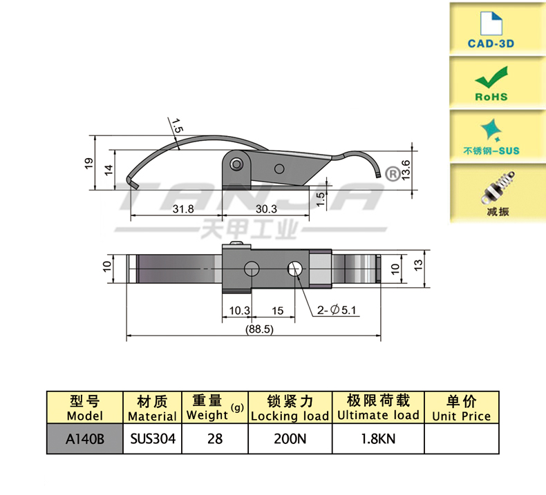 model function Length (mm) material quality Weight (g) Locking force (N) 3D