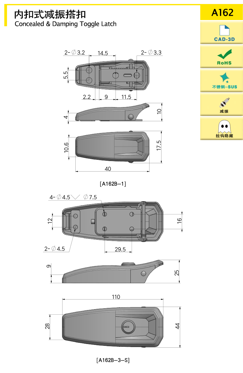 | A162B-3-S | internal toggle latch type, adjustable, with lock | 110 | sus304 | / | 400 | 4000 | Download |