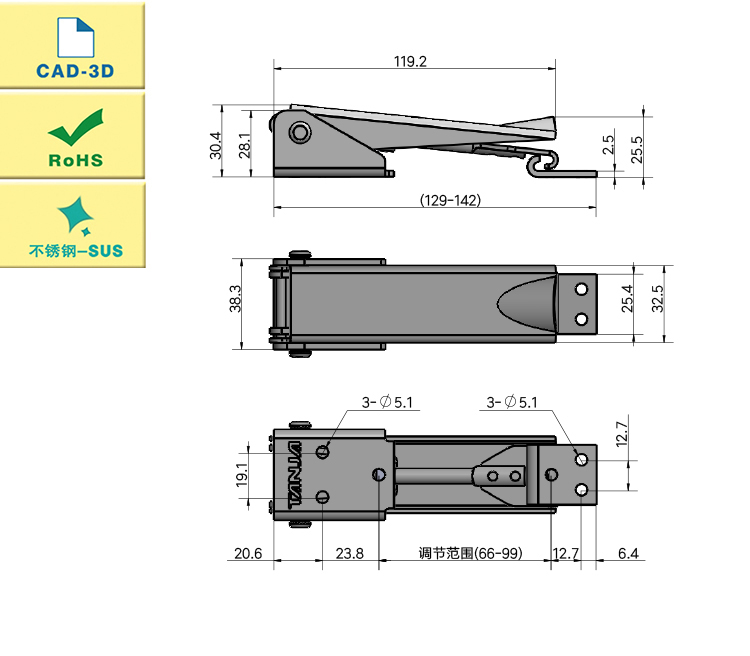 The internal buckle mechanism can hide all installation hardware and locking functions under the handle, and the lower eccentric mechanism can achieve firm off plane locking