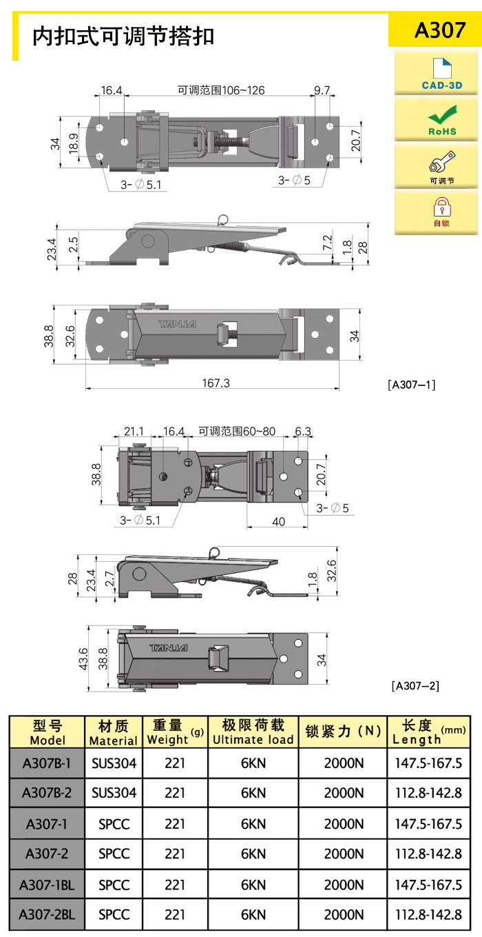 | A307B-1 | concealed,adjustable,self lock | 147.5-167.5 | sus304 | 198.81 | 2000 | Download |