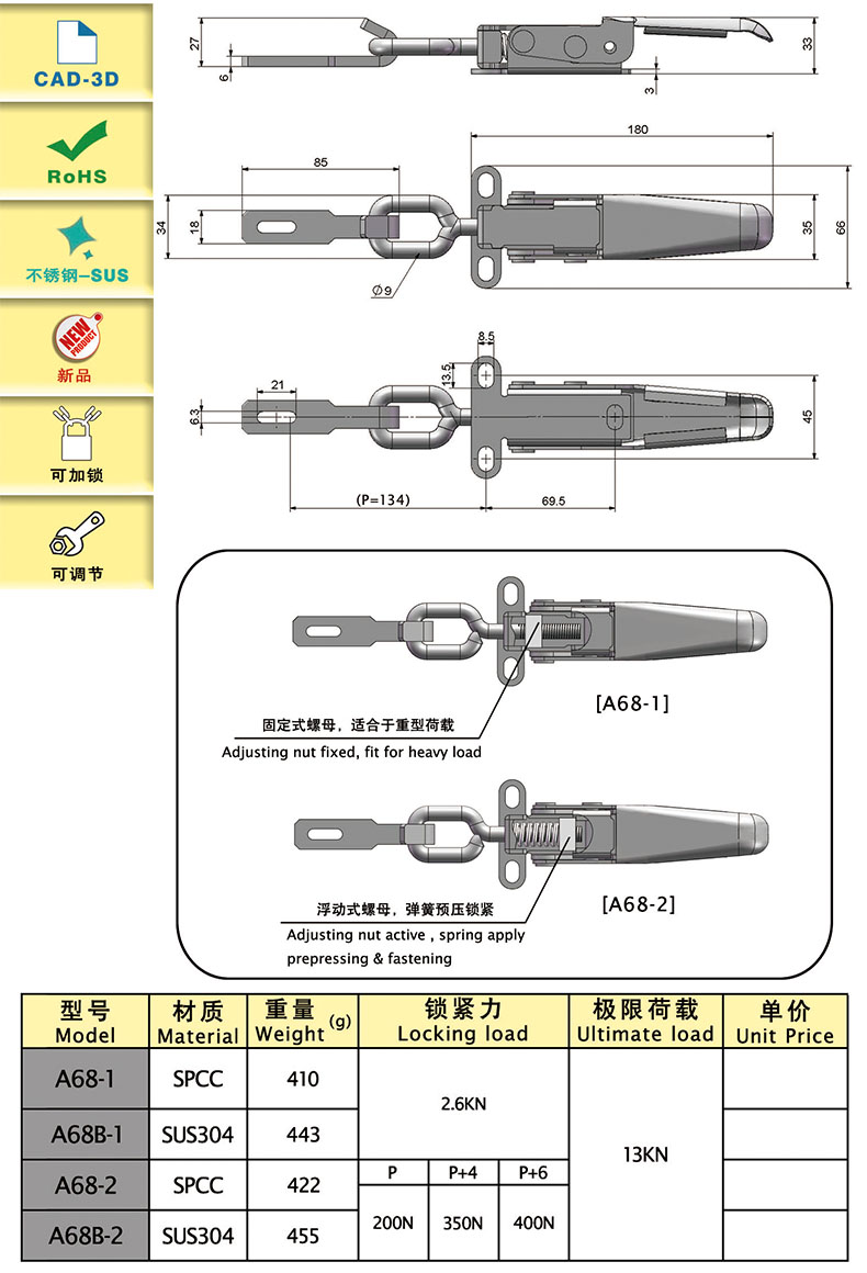 | A68-2 | adjustable,with lock | 300 | spcc | 500 | 400 | Download |