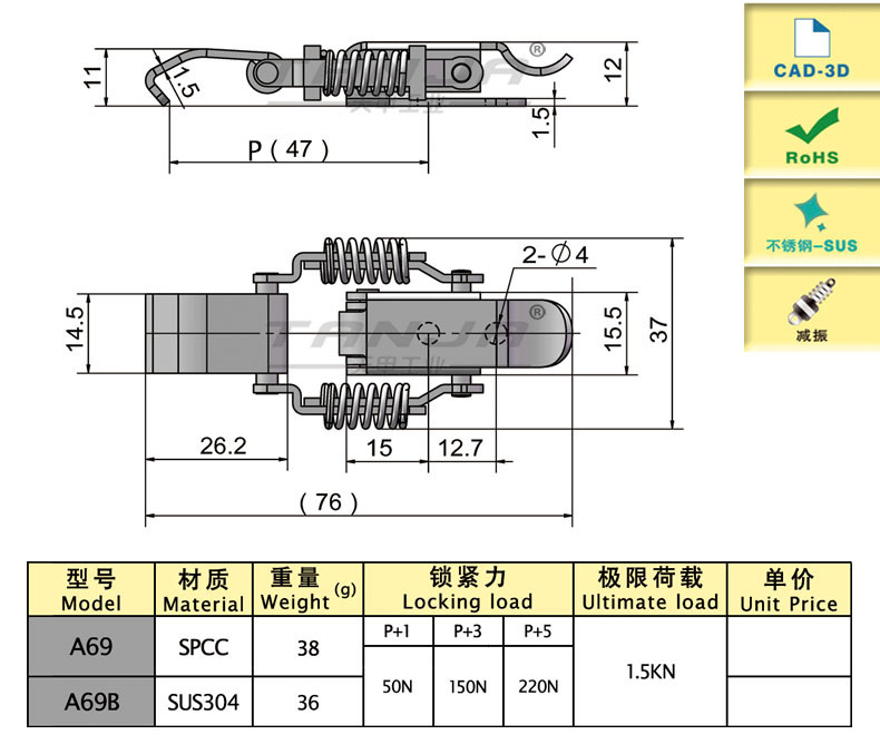 model function Length (mm) material quality Weight (g) Locking force (N) 3D