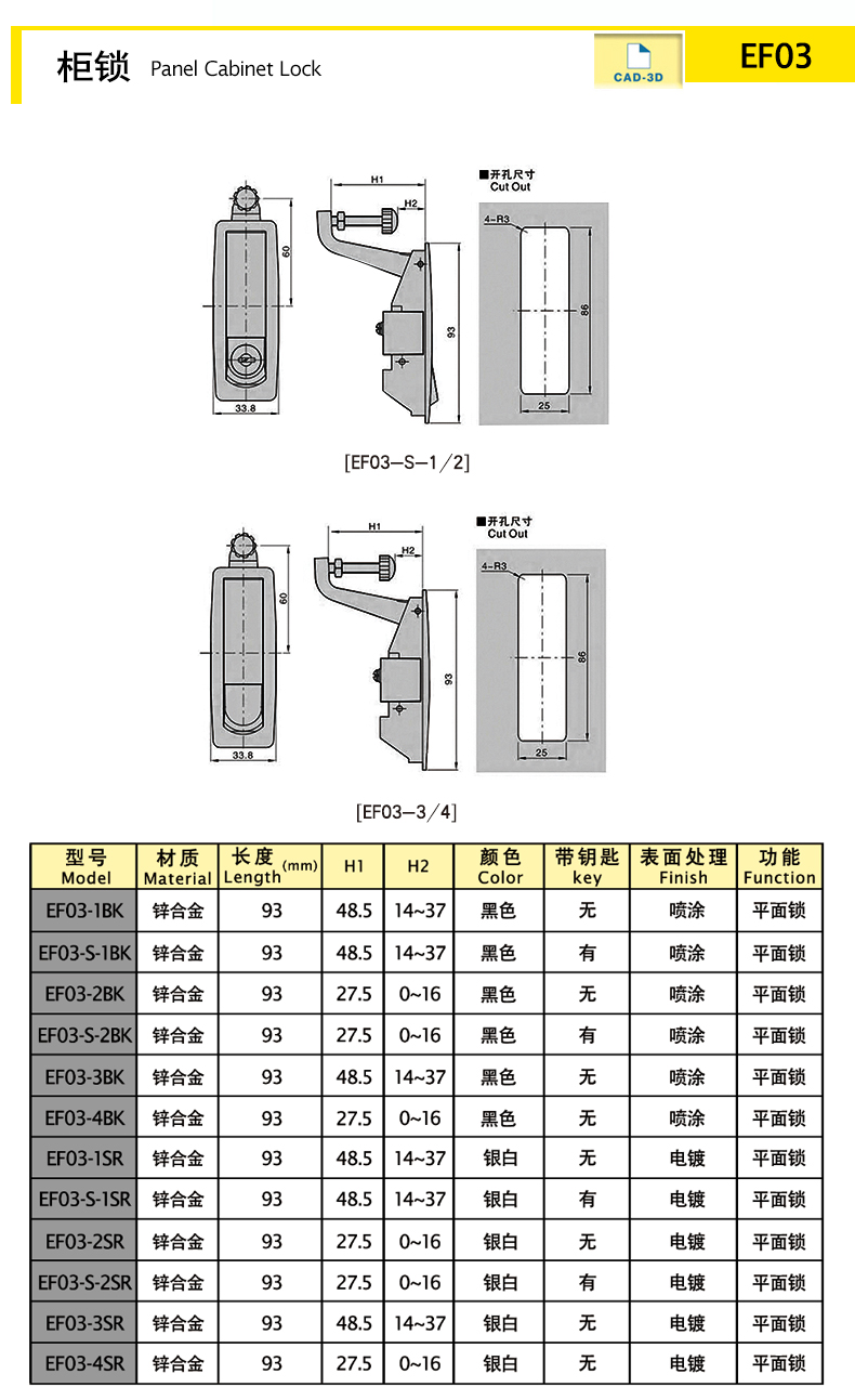 | EF03-4SR | flat lock | zinc alloy | 93 | silver white | none | electroplating | 1 | Download |