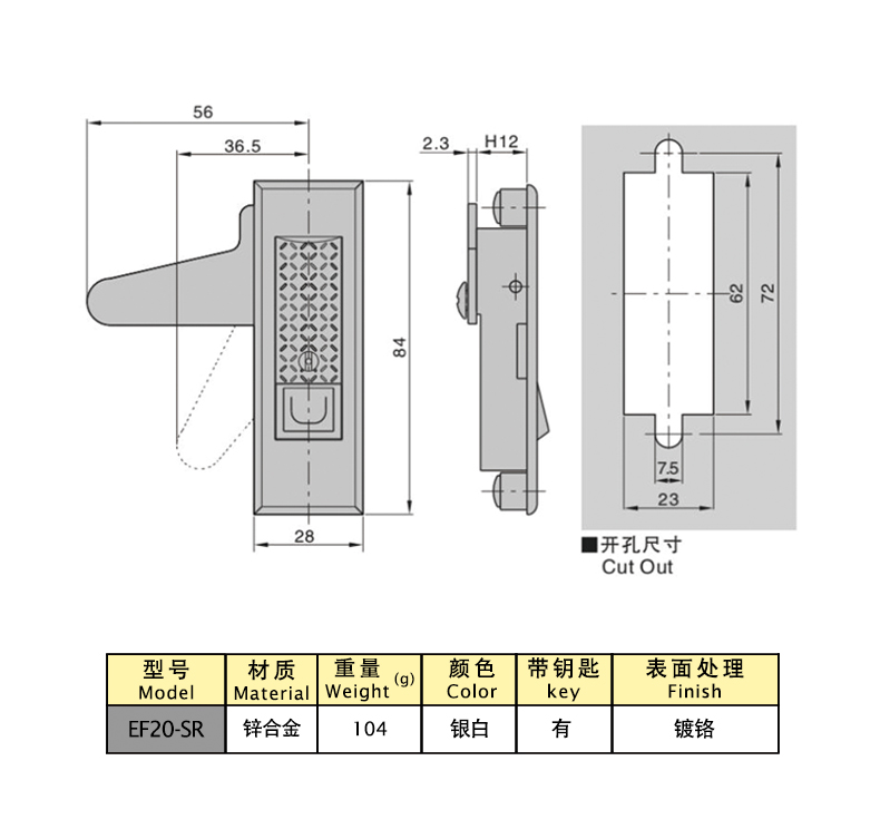 Material: Zinc alloy lock case, handle, button A3 steel lock plate accessories Surface treatment: chrome plating Structural function: Open by pressing the button and lock by pressing the handle, with separate locks without locks Note: Applicable door panel thickness 1-3mm