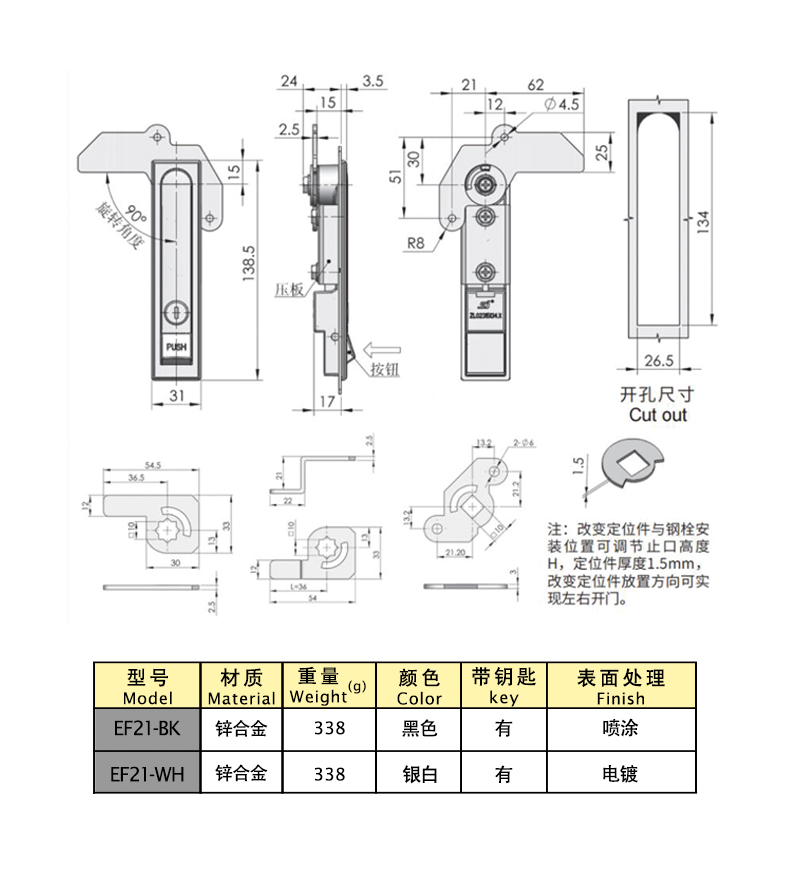 Structural function: locked by the key, the handle automatically pops up and rotates to open when pressed, and the position of the lock plate can be swapped to be universal on both sides