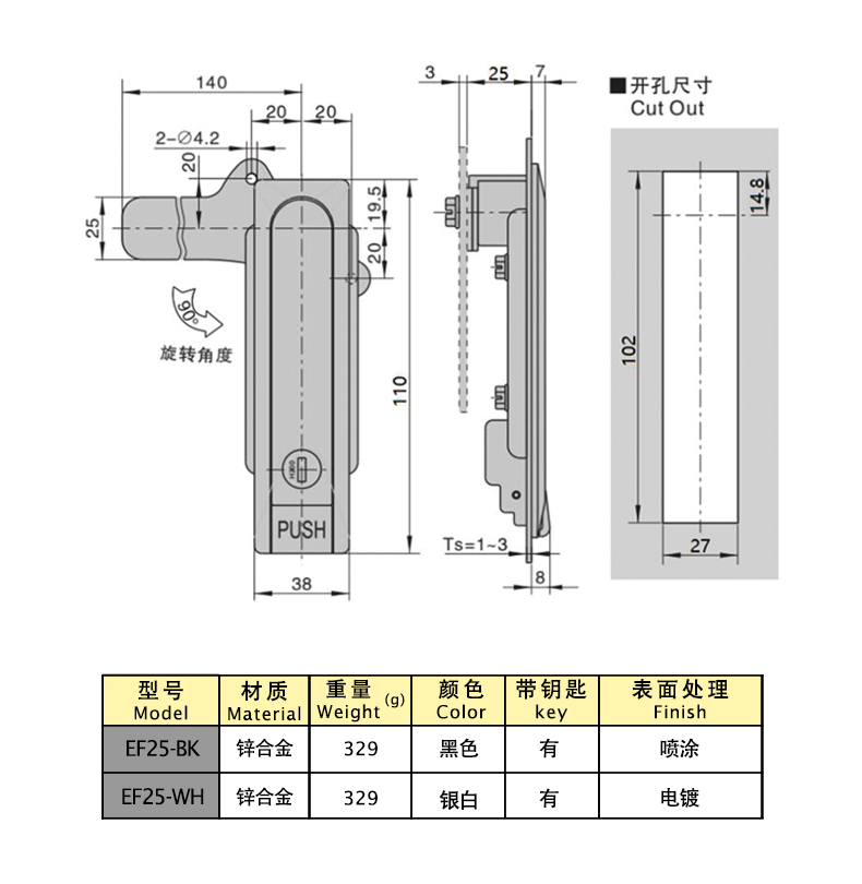 Structural function: locked by the key, the handle automatically pops up and rotates to open when pressed, and the position of the lock plate can be swapped to be universal on both sides