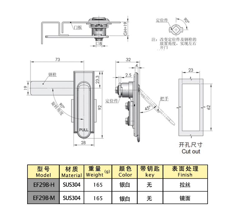 Material: SUS304 stainless steel lock housing, handle, shaft, lock plate