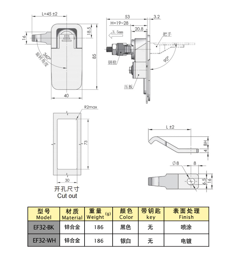 Structural function: locked by the key, the handle automatically pops up and rotates to open when pressed, and the position of the lock plate can be swapped to be universal on both sides