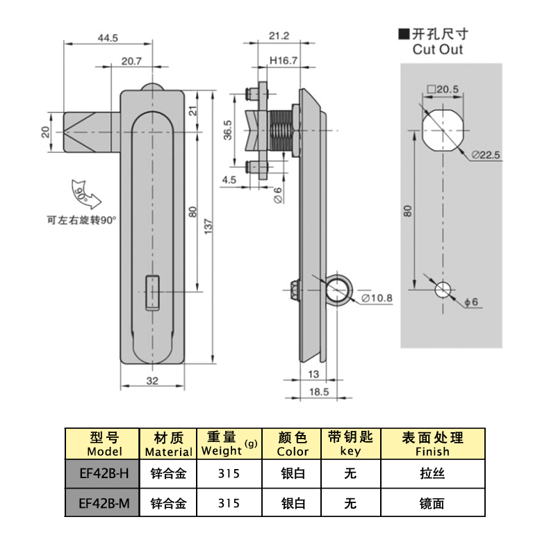 Structural function: locked by the key, the handle automatically pops up and rotates to open when pressed, and the position of the lock plate can be swapped to be universal on both sides