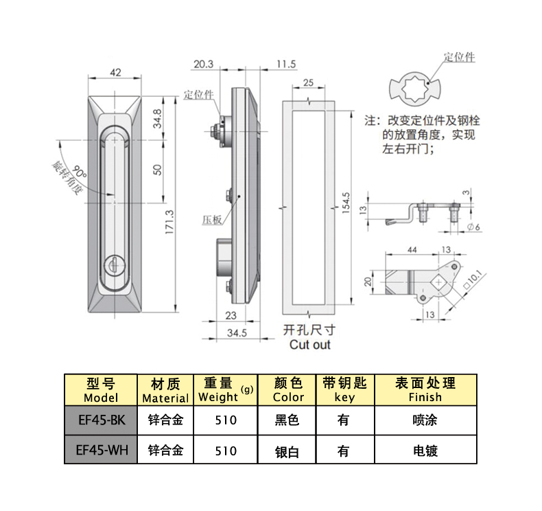 Structural function: locked by the key, the handle automatically pops up and rotates to open when pressed, and the position of the lock plate can be swapped to be universal on both sides