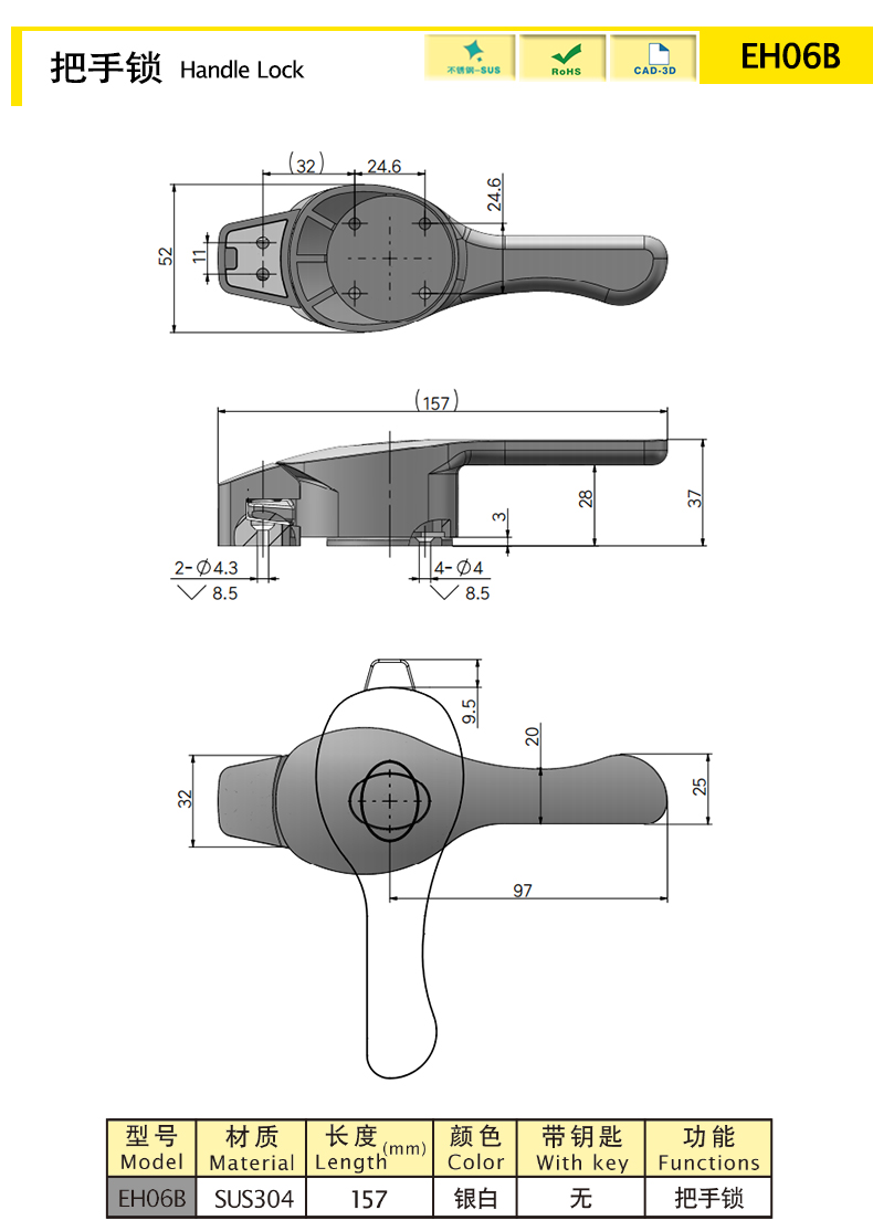 | EH06B | handle lock | sus304 | 157 | silver white | nothing | polishing | 524.51 | Download |