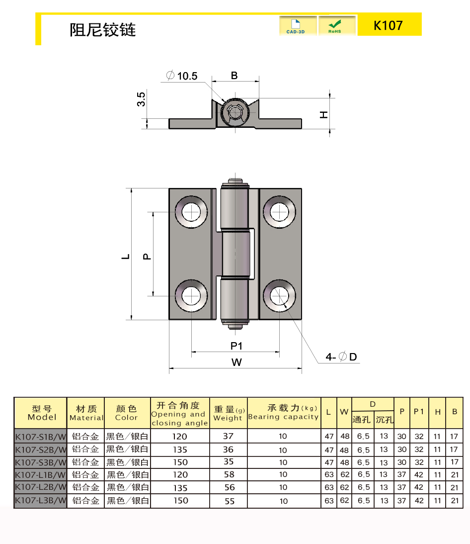 | K107-1-3SR | aluminum alloy | 48 | silver white | 35 | light damping | Download |