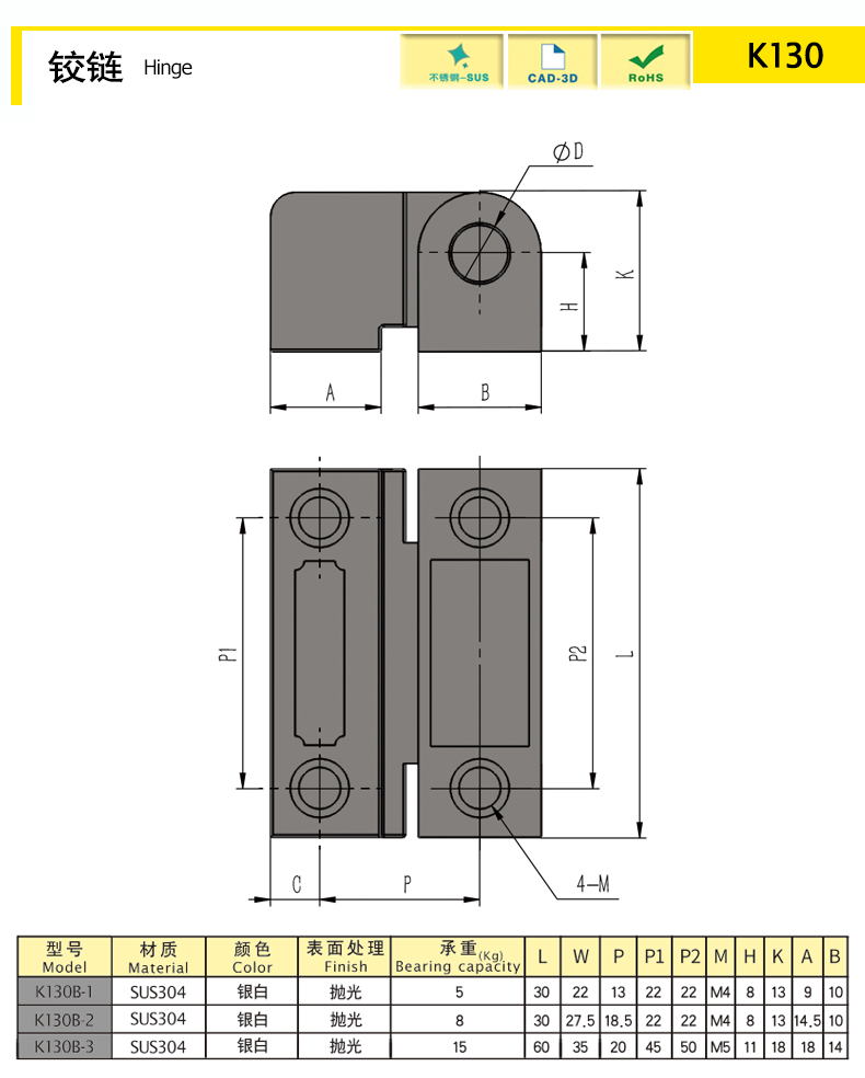| K130B-3M | sus304 | 60 | silver white | 199.31 | heavy load | Download |