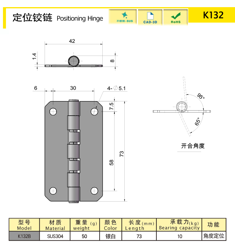 The maximum opening and closing angle is 160 °, and the positioning angle is 95 °.