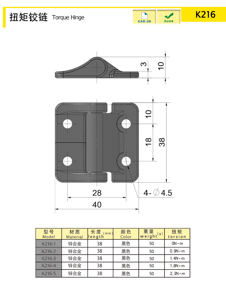 | K216-3 | zinc alloy | 38 | black | 50 | fixed torque | Download |