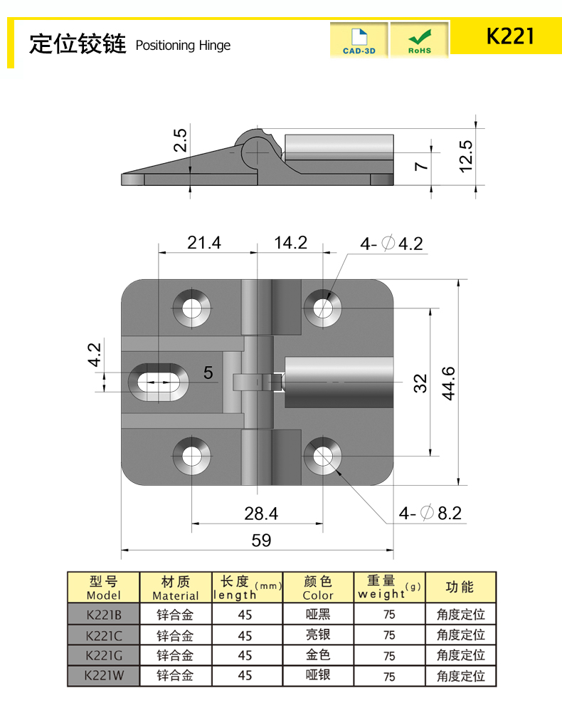 | K221-SR | zinc alloy | 45 | silver white | 66.41 | angle positioning | Download |
