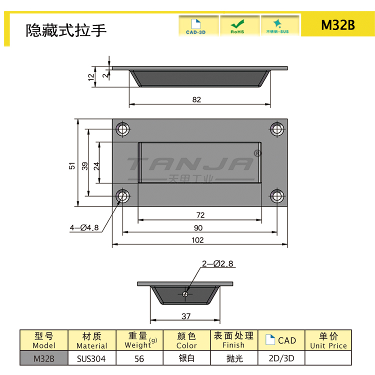 Stainless steel hidden handle, available in different sizes and shapes, with installation holes that can be hidden or exposed