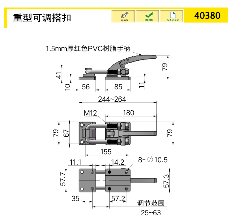 Cast steel buckle body, capable of withstanding heavy loads, adjustable screw, which can change installation distance or locking force
