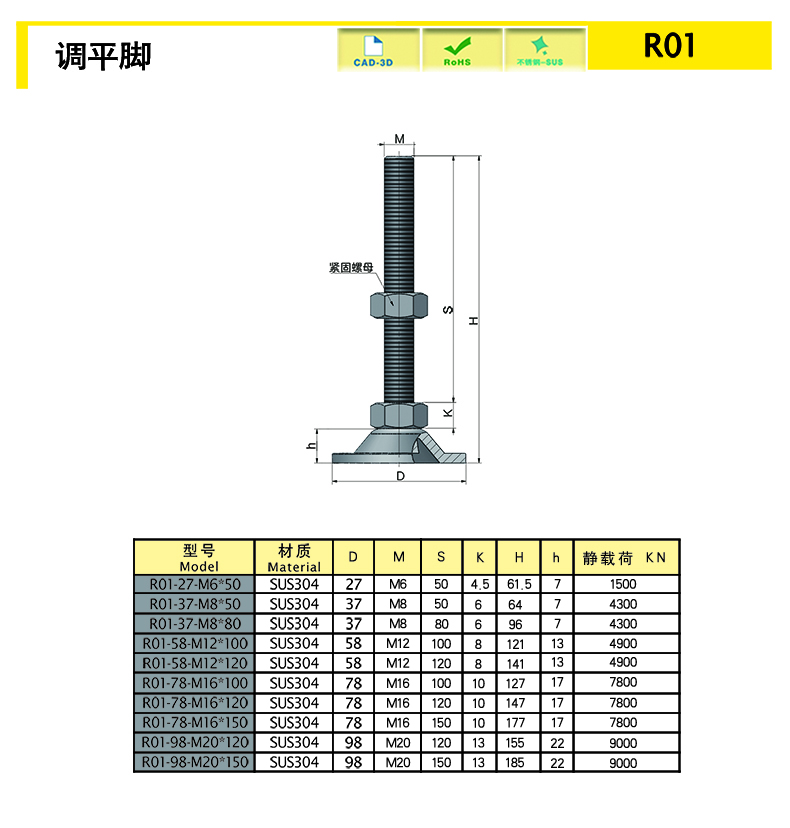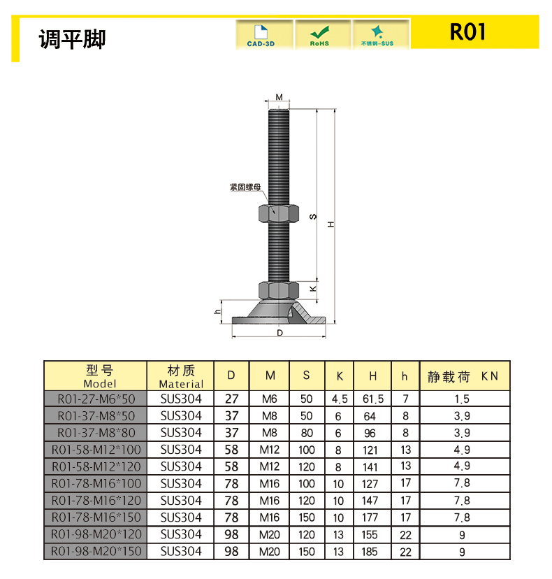 | model | material quality | Diameter D | M | S | K | H | h | Weight (g) | Static load (KN) | 3D |