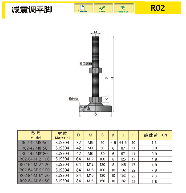| model | material quality | Diameter D | M | S | K | H | h | Weight (g) | Static load (KN) | 3D |