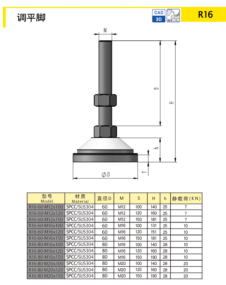 | model | material quality | Diameter D | M | S | h | h1 | Weight (g) | Static load (KN) | 3D |